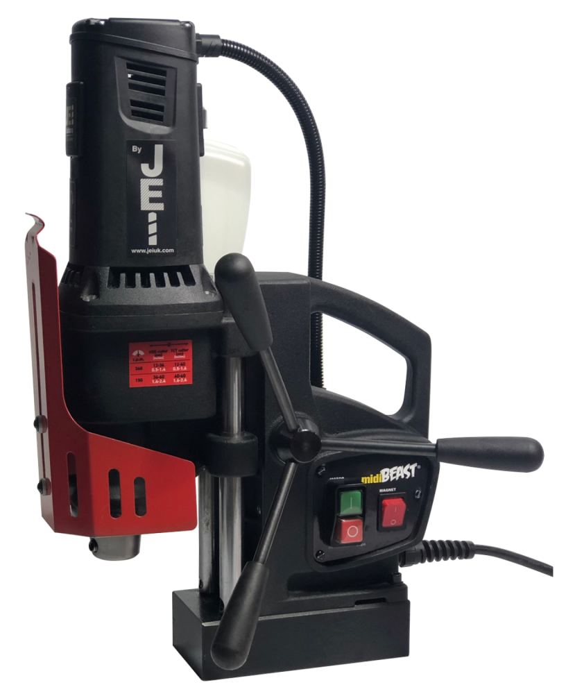 The MidiBeast™ is the latest new member of the MAGBEAST® family. Designed specifically to lessen the load on the steel fabricator's fleet of smaller portable drilling machines, such as the MiniBeast™, to make sure intensive, heavier jobs can be completed in a faster time frame without overloading and using less cutters.